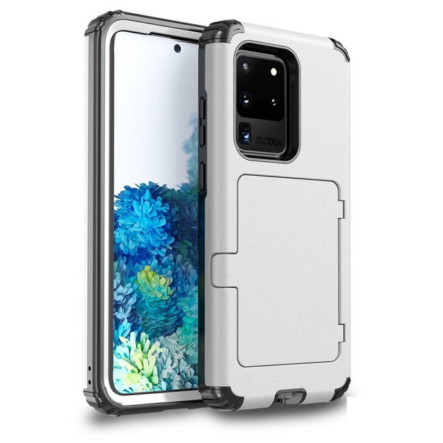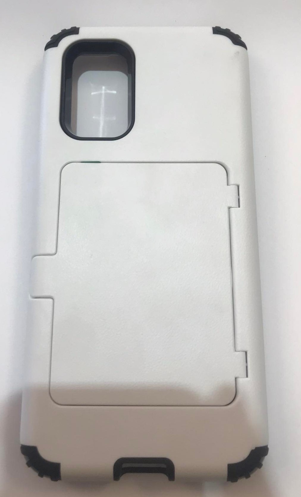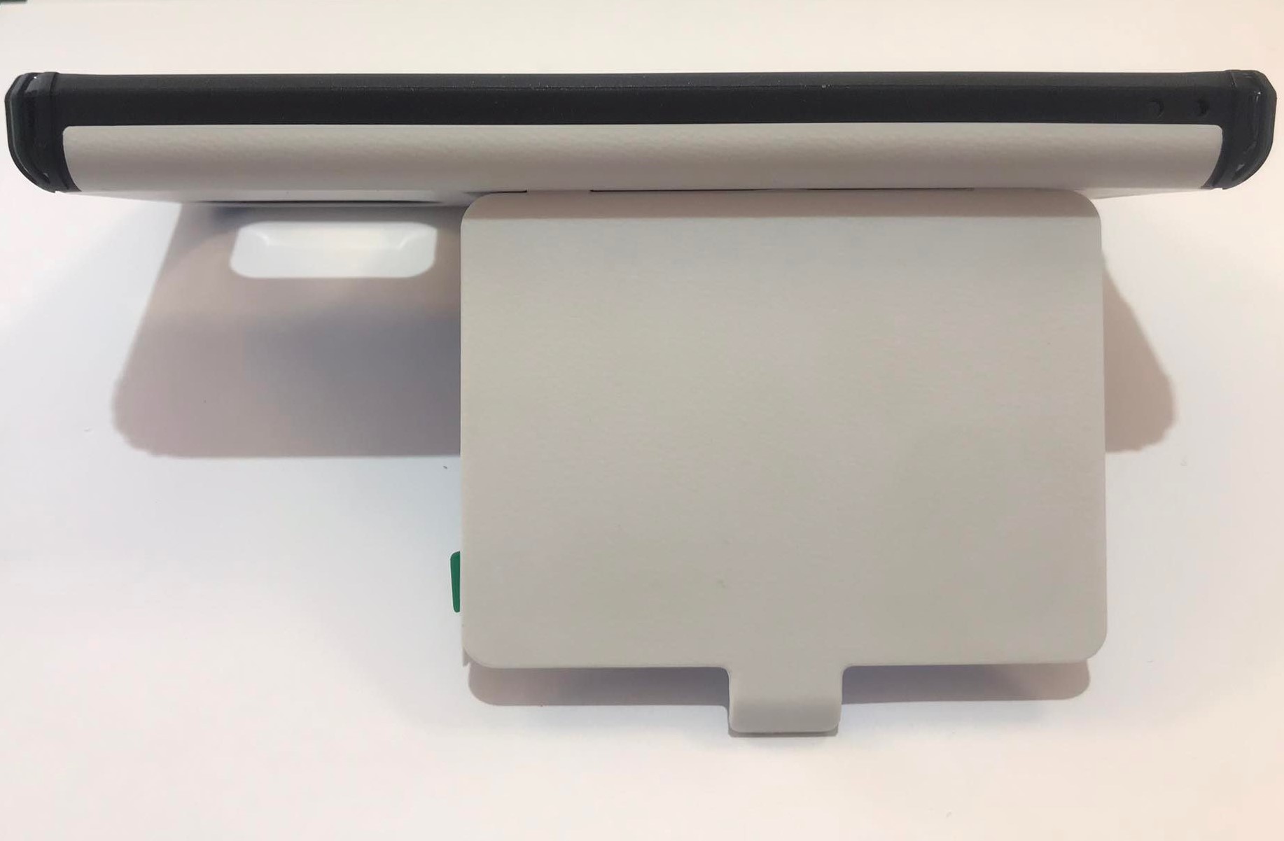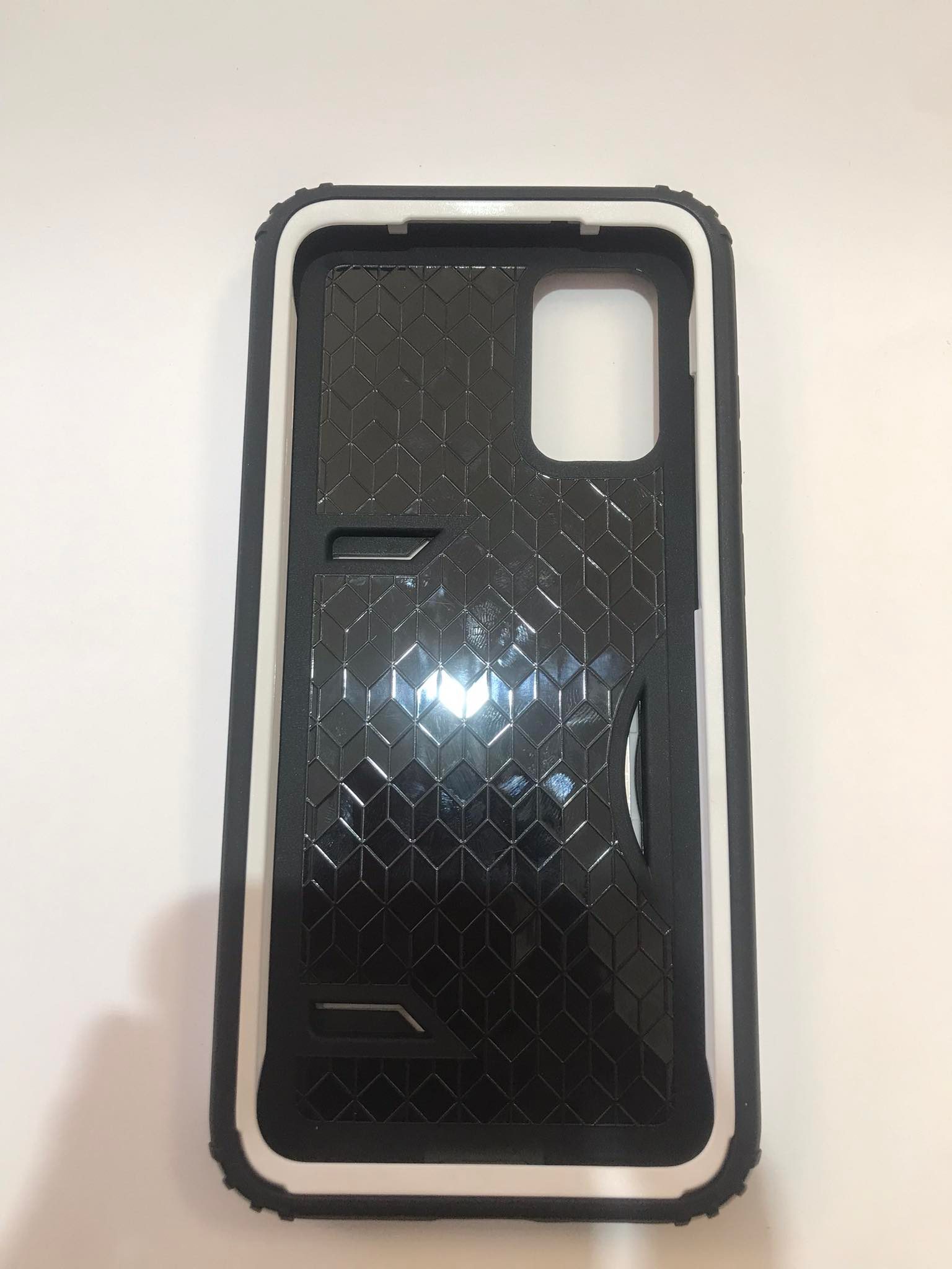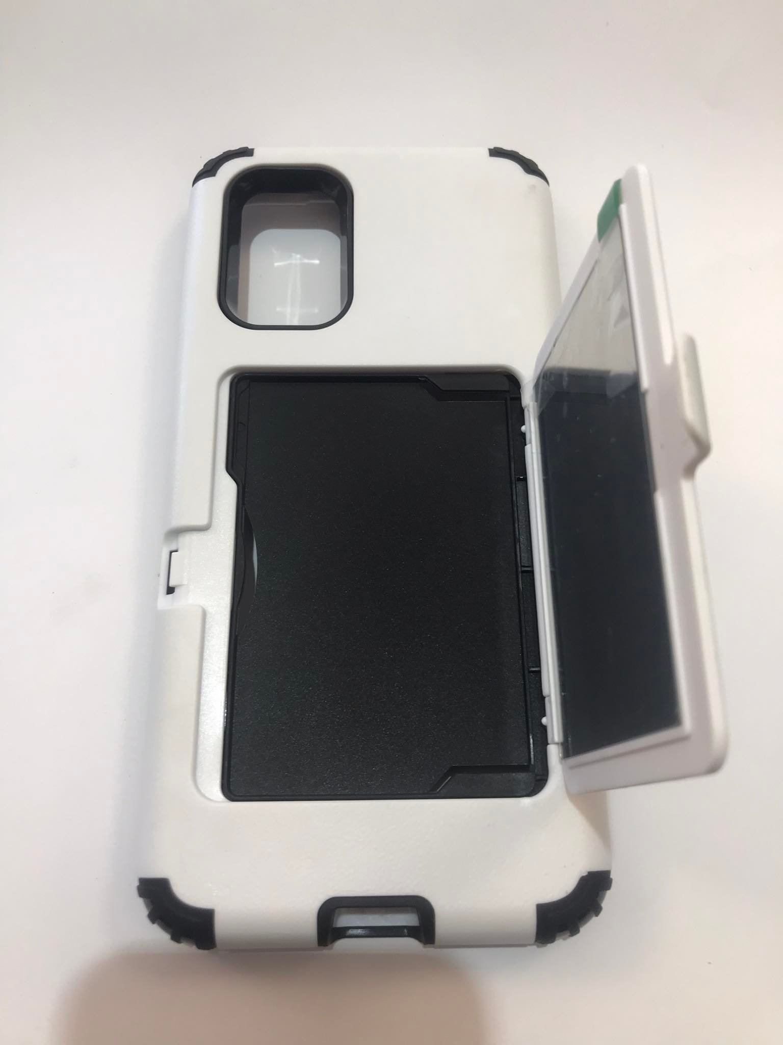 Pancerne etui w kolorze biało-czarnym z podstawką oraz lusterkiem .