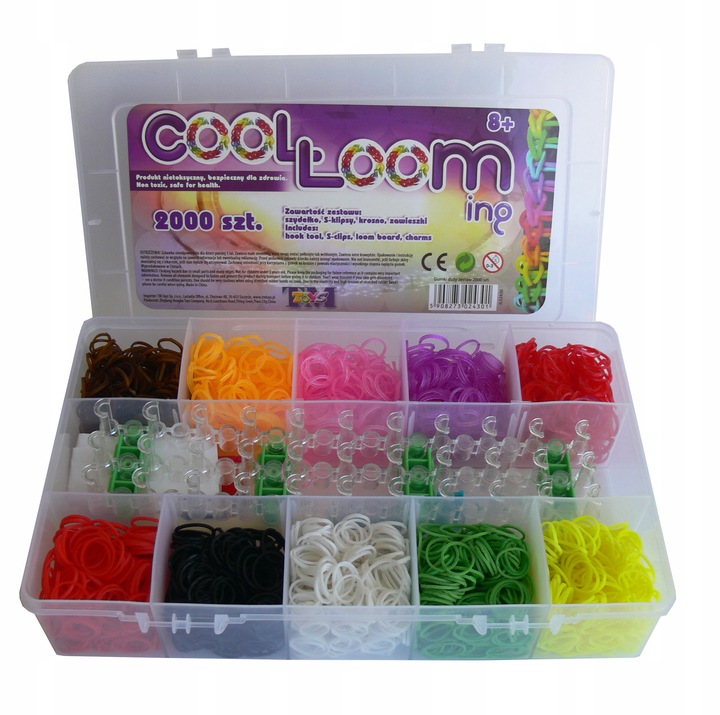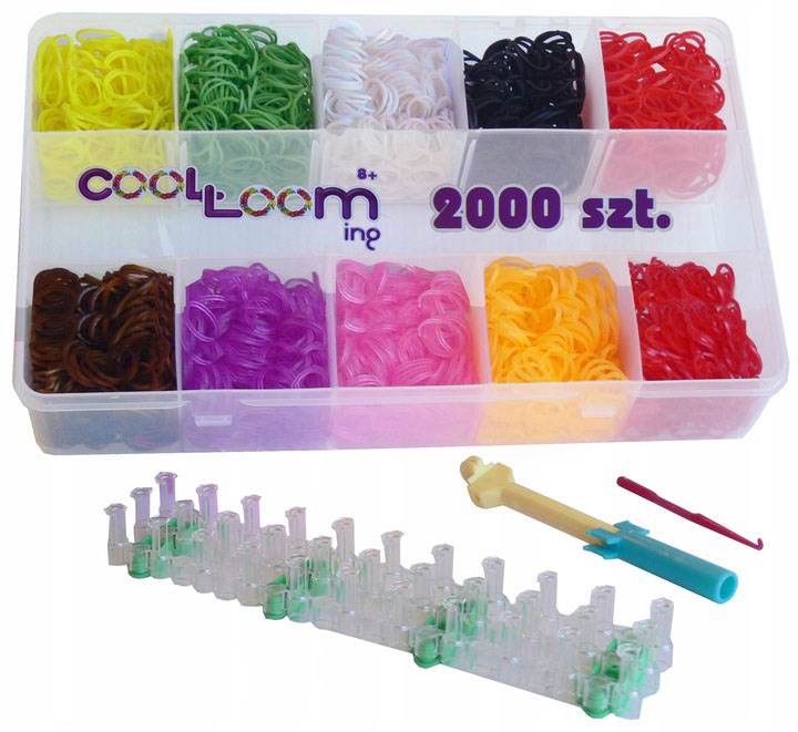 Kreatywny zestaw składający się z 2000 szt gumek do robienia biżuterii zarówno dla dziewczynek jak i chłopców. To prostokątny warsztat tkacki, na którym można wykonać z kolorowych gumek bransoletki, pierścionki czy naszyjniki. Kolorowe bransoletki można dowolnie komponować w wybranych przez siebie motywach i kolorach.