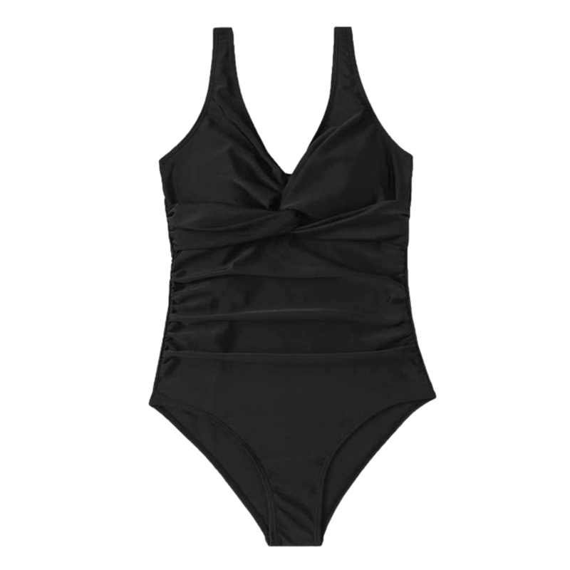 Jednoczęściowy czarny strój kąpielowy z marszczeniami