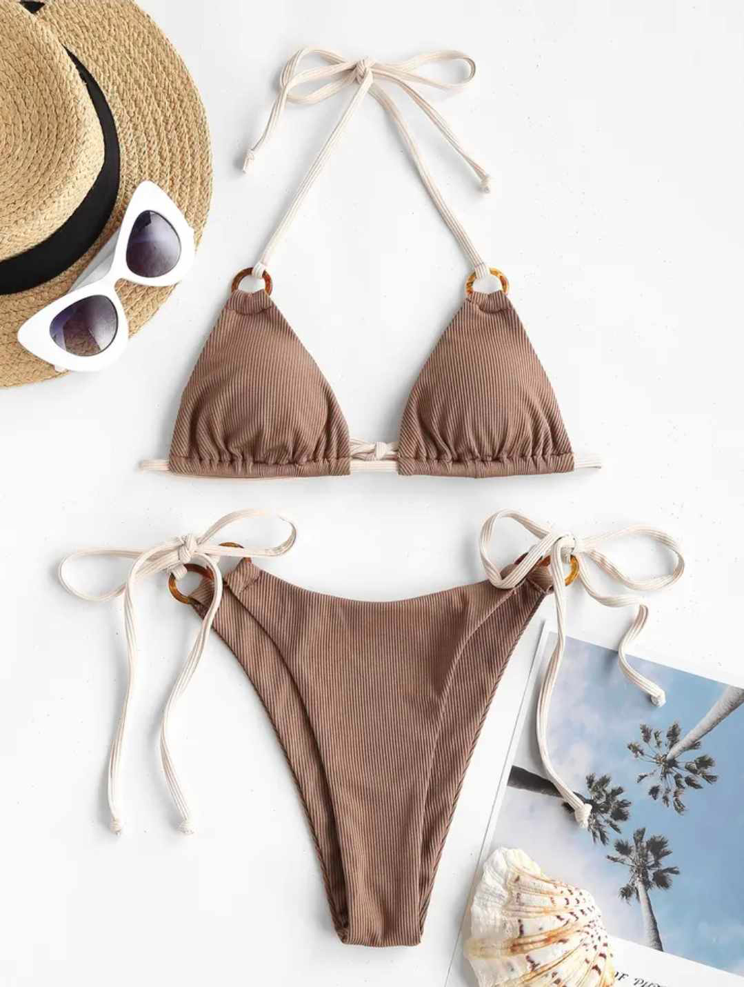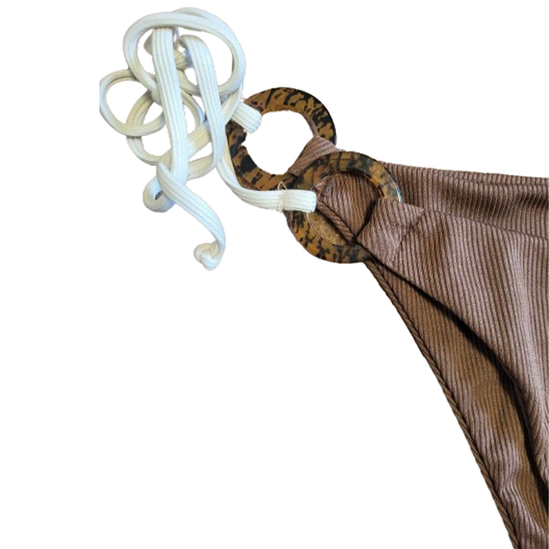 Prążkowany strój kąpielowy z wiązaniem połączonym na dekoracyjnych kółkach.