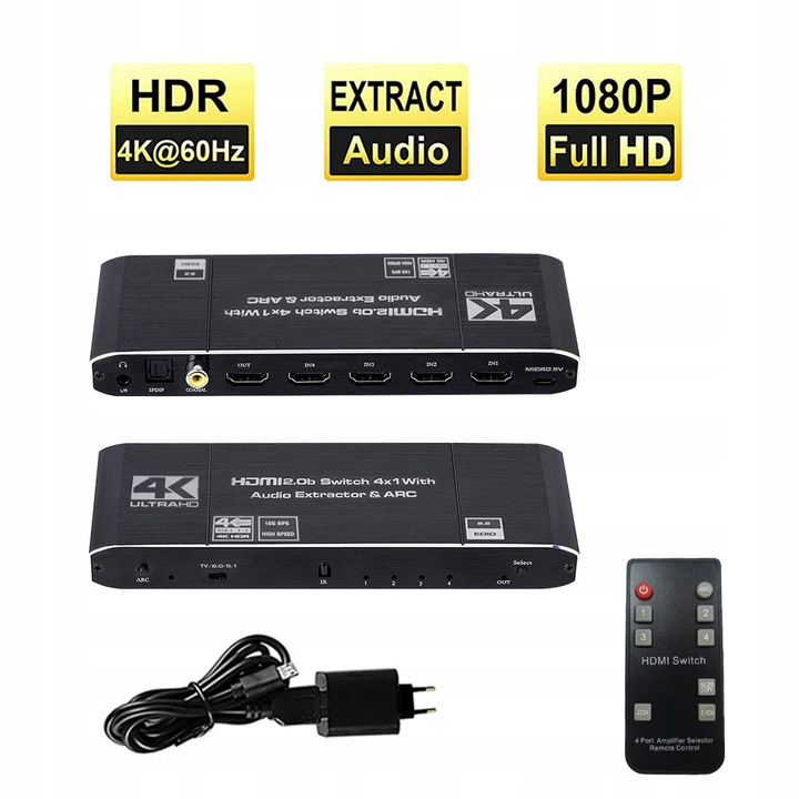 Jest to wysokiej jakości przełącznik z 4 wejściami HDMI i 1 wyjściem HDMI. Wyjście Toslink obsługuje funkcję kontroli powrotu dźwięku ARC, wyjście Jack 3.5mm obsługuje funkcję ekstrakcji dźwięku. System obsługuje wszystkie formaty telewizji 3D oprócz wszystkich formatów HDTV do 4Kx2K@60Hz RGB8:8:8. Co więcej, pilot daje użytkownikom pełną kontrolę nad wyborem źródeł i sprawia, że urządzenie jest niezwykle przyjazne dla użytkownika.