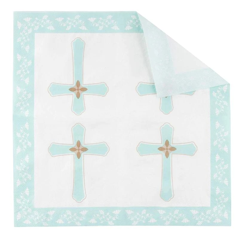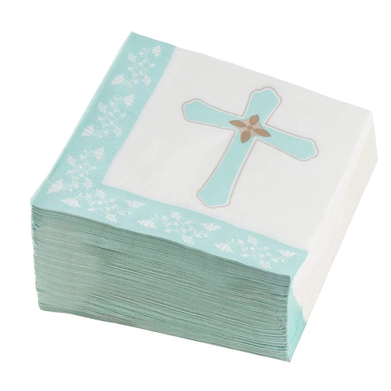 - ZESTAW ZAWIERA: 150 arkuszy 2-warstwowych serwetek papierowych z krzyżem na białym tle i turkusową lamówką w kwiaty.