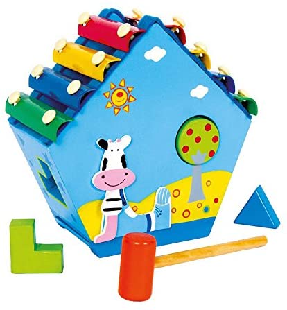 Dzieci odkrywają świat wszystkimi zmysłami! Małymi palcami mogą wprowadzić kolorowe drewniane kształty w przewidziane do tego celu otwory lub sprawić, że muzyka zabrzmi dzięki lakierowanym metalowym listwom – przyjemność dla uszu. Dzięki temu mogą ćwiczyć swoje umiejętności motoryczne podczas zabawy. Aby powtórzyć ćwiczenie osadzania kształtów, możesz bardzo łatwo usunąć podłogę tego ładnego drewnianego domu pomalowanego na różne kolory.
