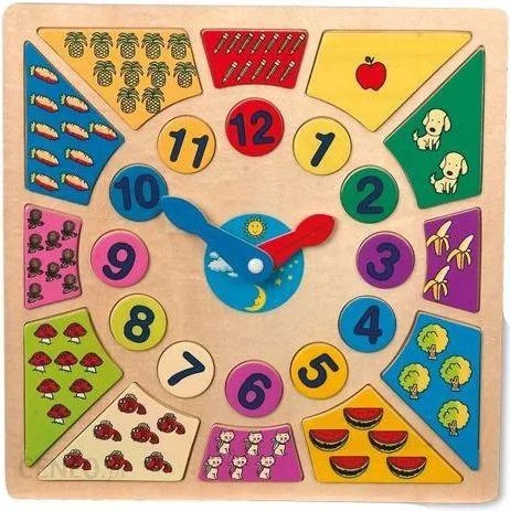 Zegar z kolorowymi obrazkami pełni trojaką funkcję. Po pierwsze – ułatwia maluchowi zrozumienie abstrakcyjnego pojęcia czasu; po drugie – uczy cyferek i liczb; i po trzecie – jest fantastyczną układanką! Wszystkie elementy zabawki są ruchome i dziecko samo konstruuje zegar, ucząc się przy okazji właściwego rozmieszczenia godzin na tarczy. Motywy umieszczone obok poszczególnych cyfr pomagają zrozumieć i zapamiętać ich wartość. Fantastyczna rozrywka i nauka w jednym! Polecamy!