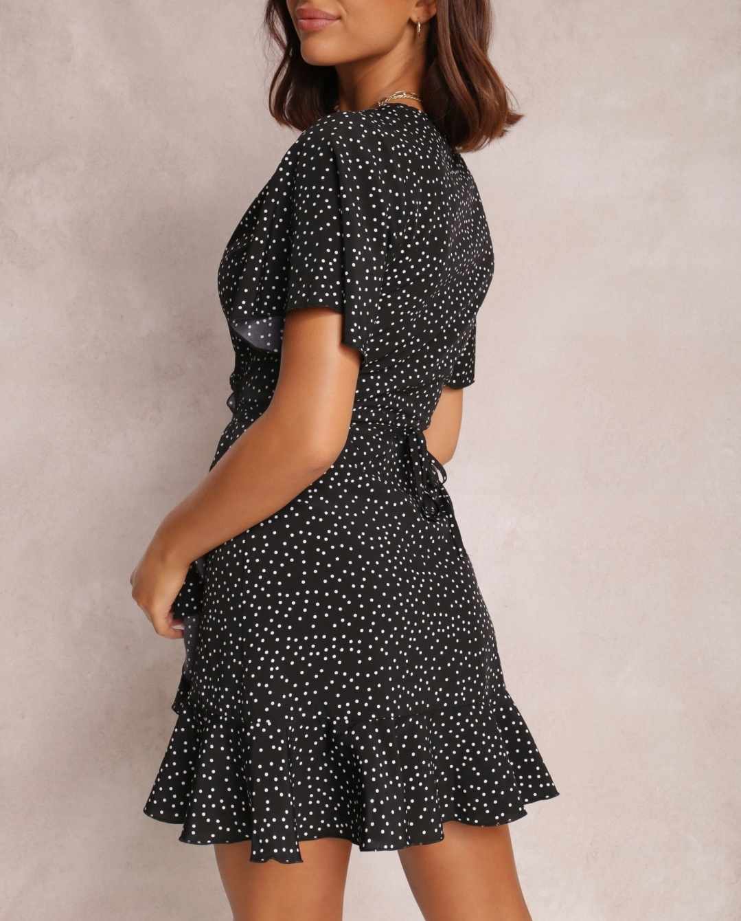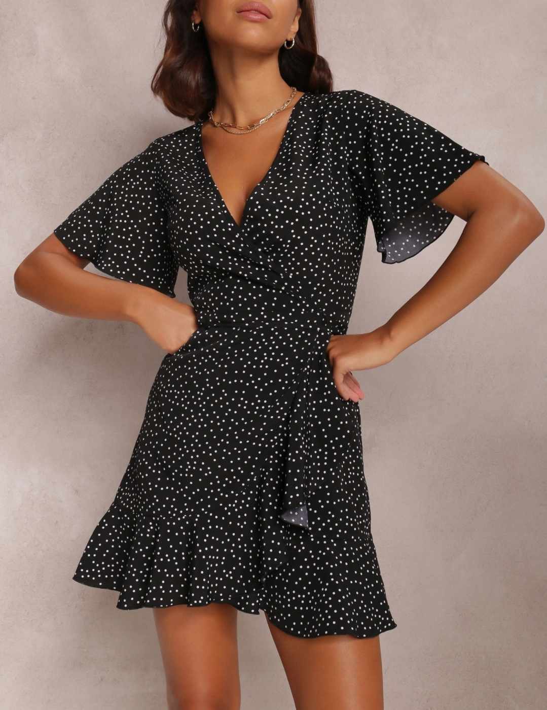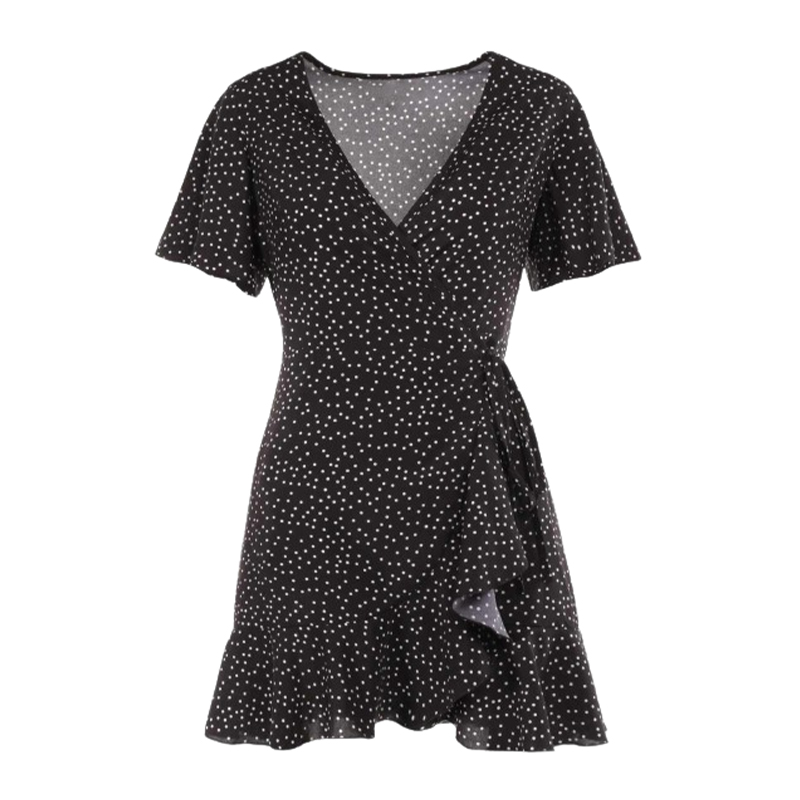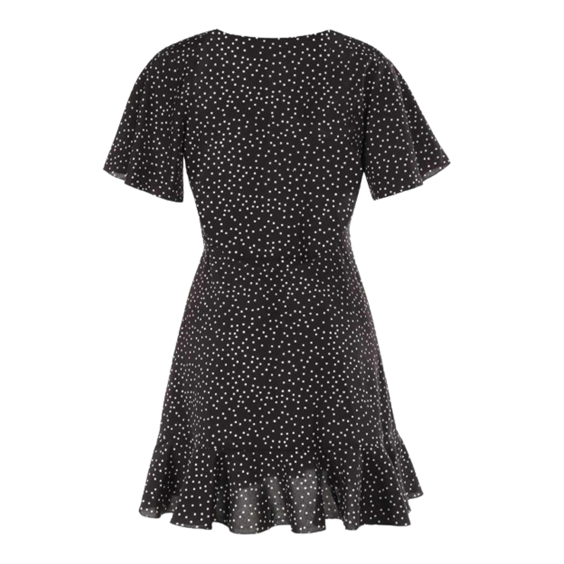Damska letnia czarna sukienka w groszki z falbanką