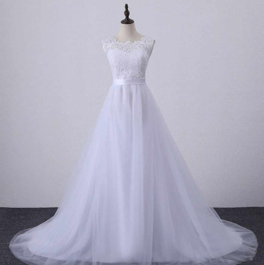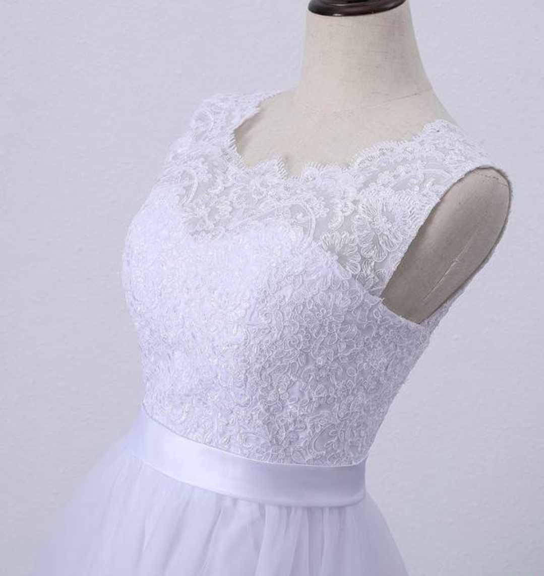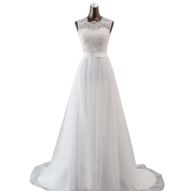 Piękna suknia ślubna w kształcie litery A, bez rękawów, góra zdobiona delikatną koronką