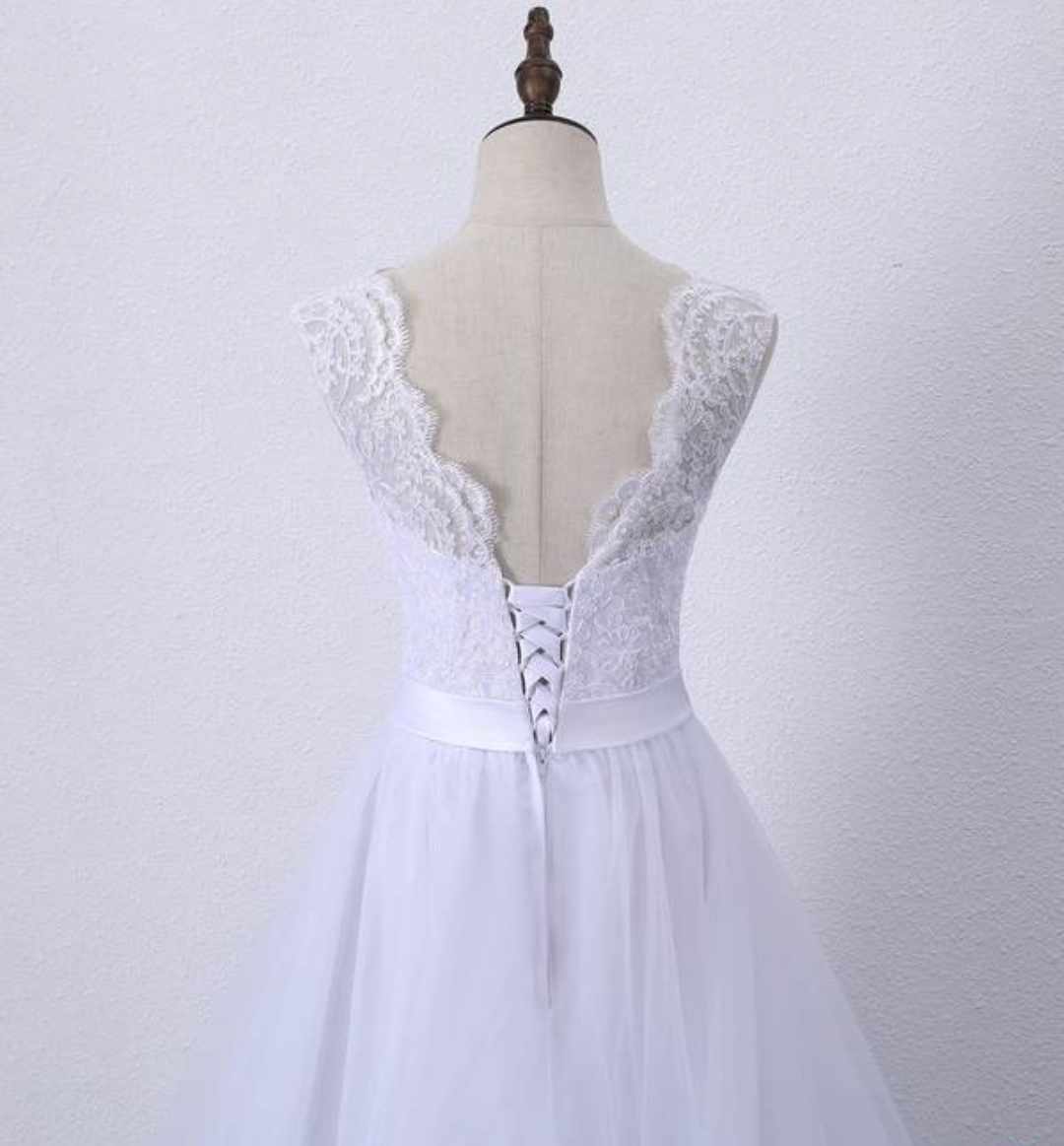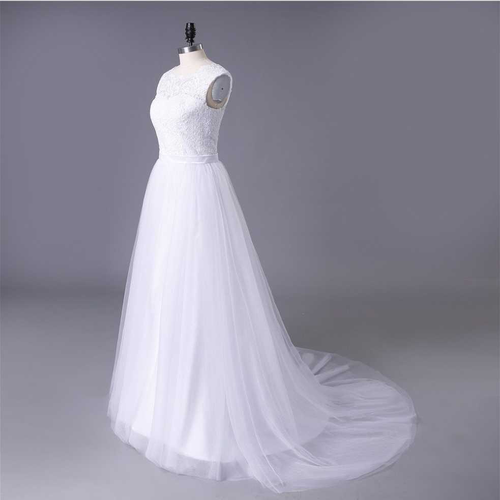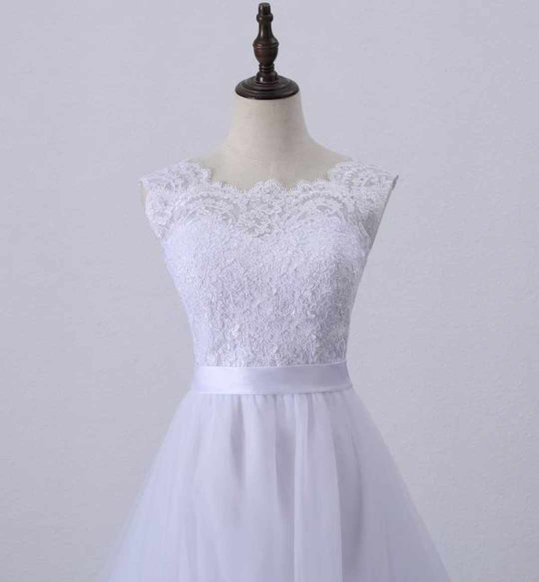 Piękna suknia ślubna w kształcie litery A, bez rękawów, góra zdobiona delikatną koronką