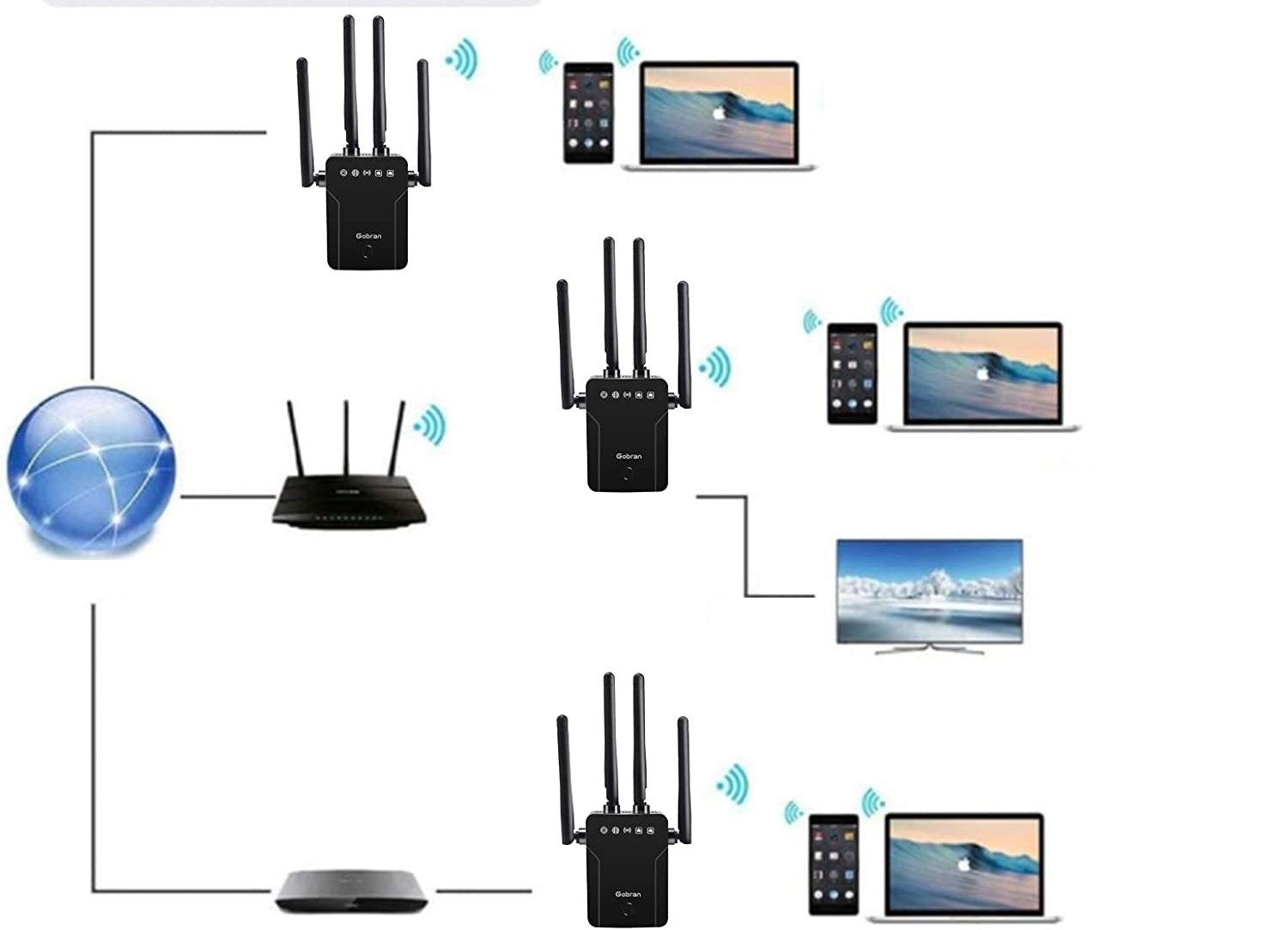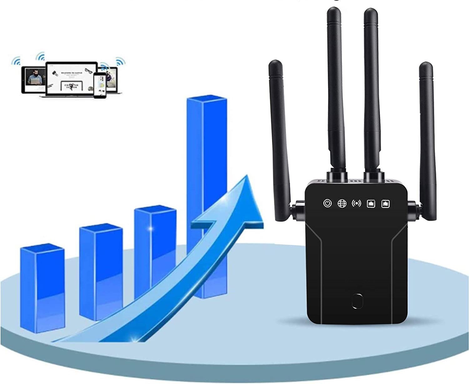 - Wzmacniacz: jako bezprzewodowy przedłużacz sygnału rozszerza zasięg istniejących sieci WiFi.